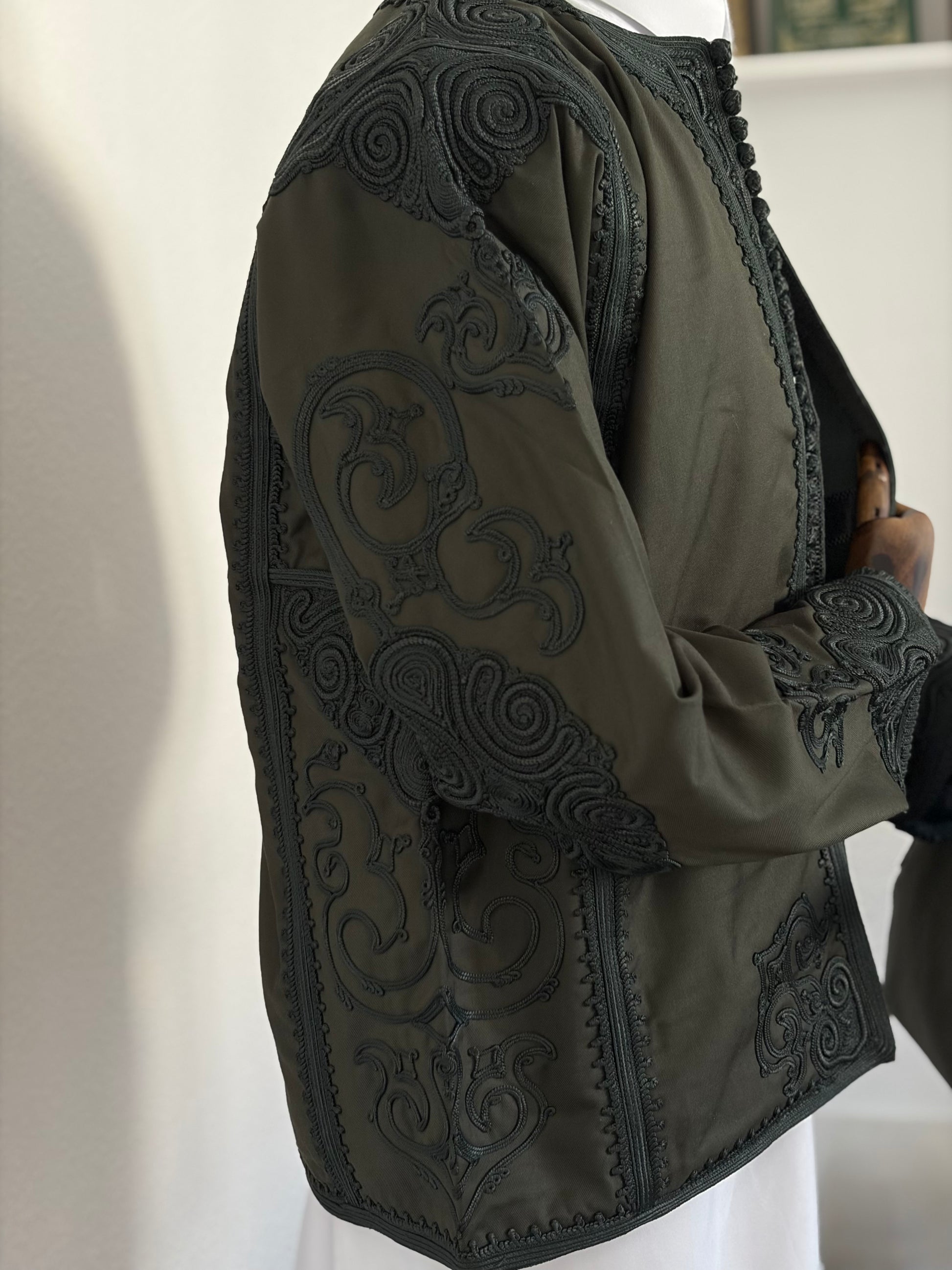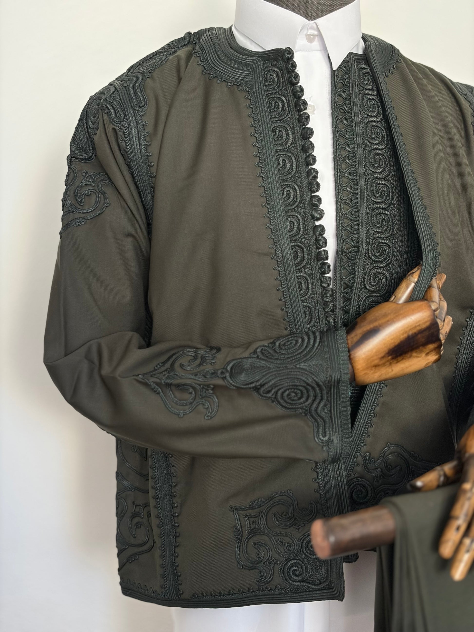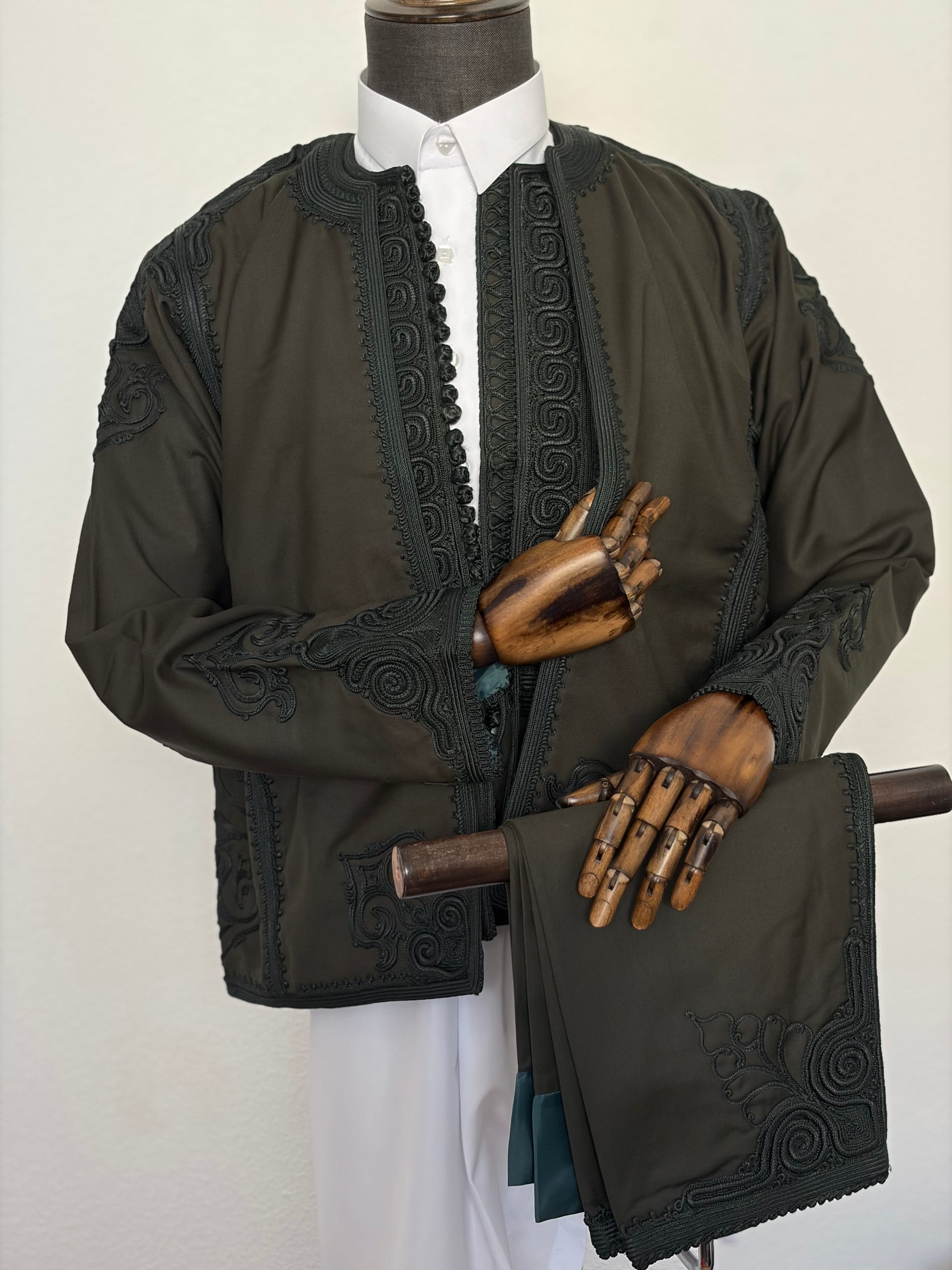 A deep emerald green giving an intense and deep aura. Crafted with smooth Italian material, this zboon set has a shiny appearance. The monotone embroidery is subtle yet loud, it’s focused on the shoulders, elbows and wrists leaving the front of the jacket simpler. The faremlla has a heavy embroidered front.