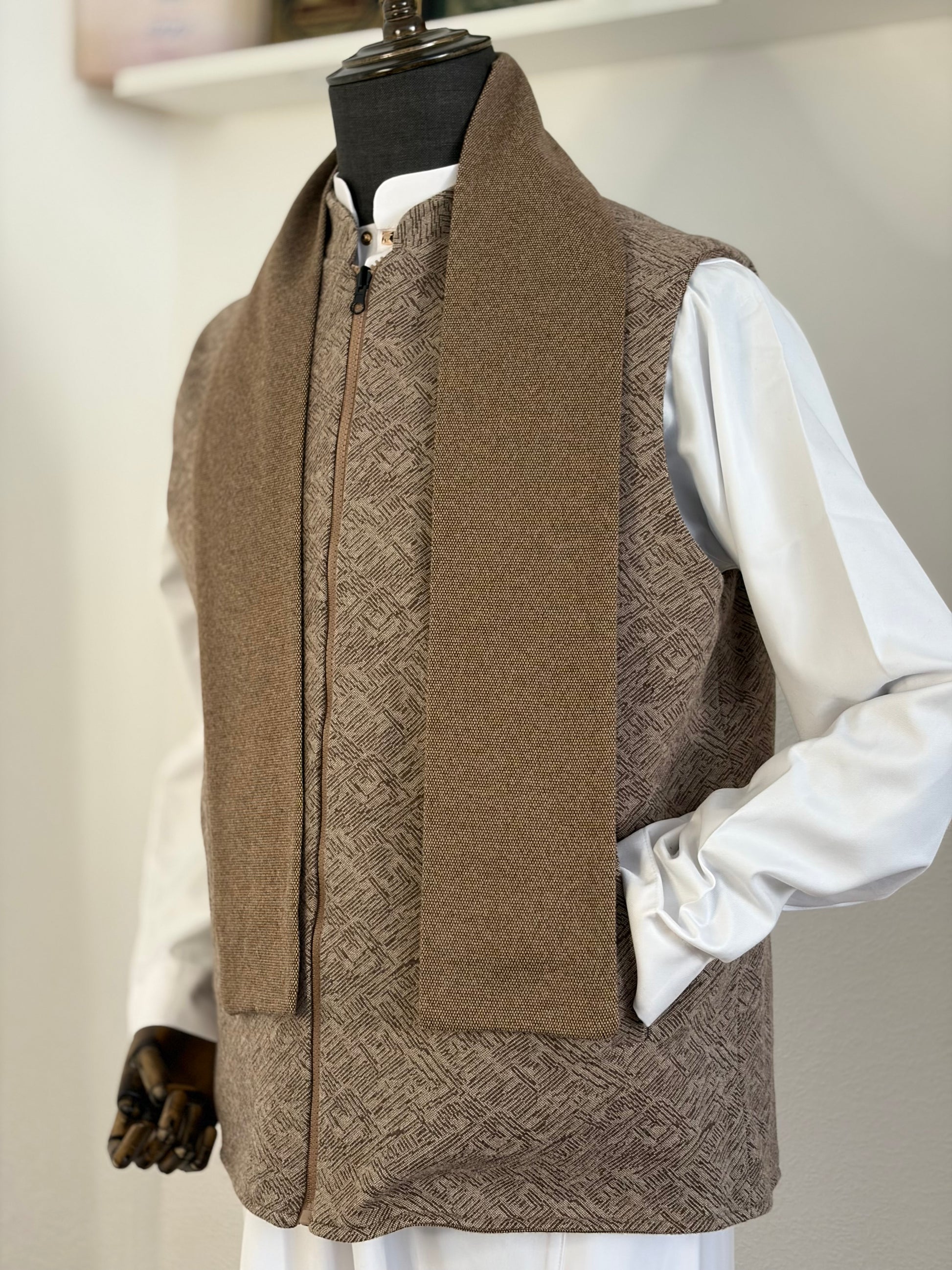 Our double sided waistcoat paired with a matching scarf is the ultimate go to for any season of the year. One side features a simple plain design and the other features a geometric pattern to brighten up any outfit.